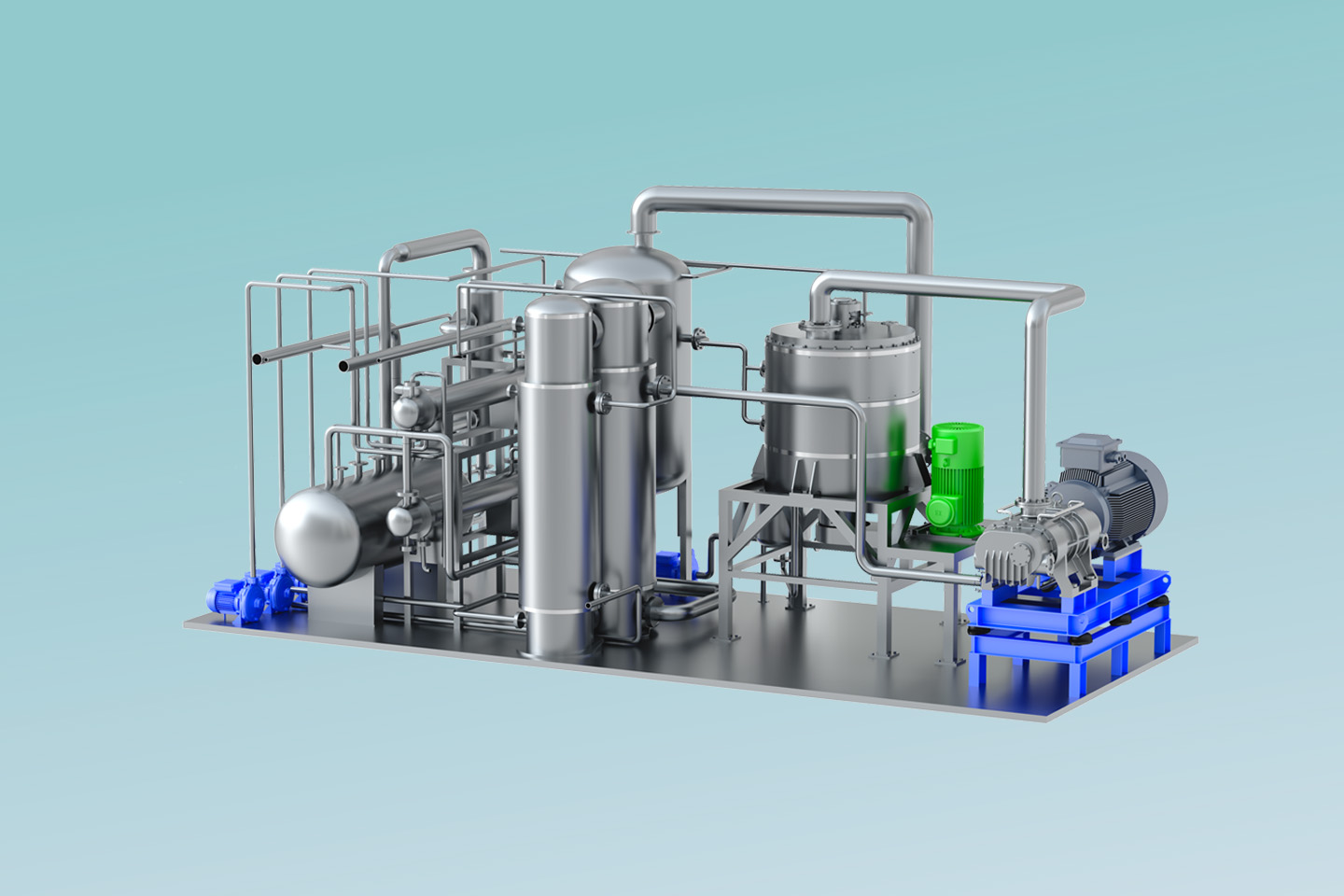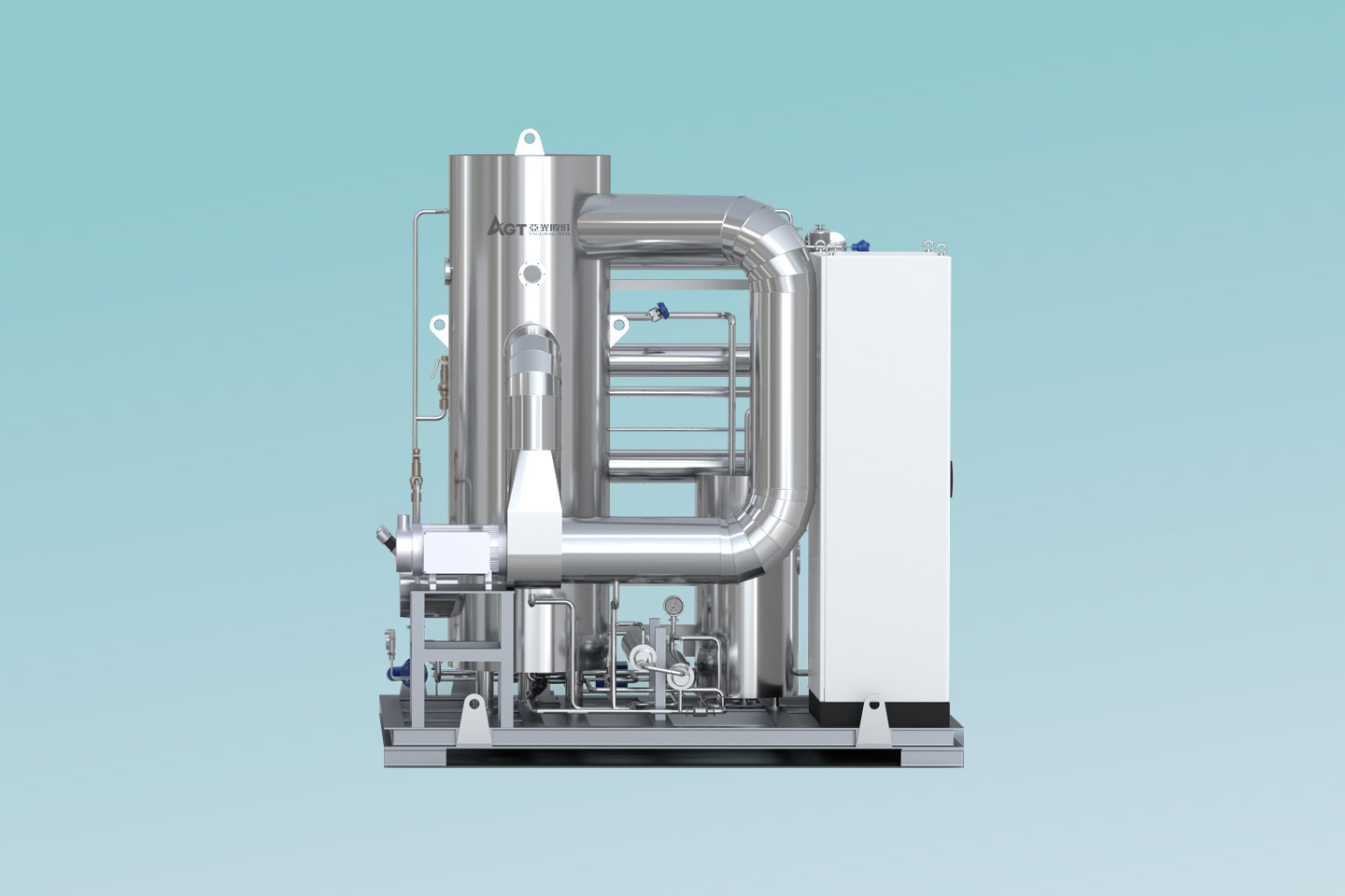 MVR熱泵精餾系統(tǒng)以高效旋轉(zhuǎn)精餾床為基礎(chǔ),利用離心力場代替重力場,強(qiáng)化相與相之間的相對(duì)速度和相互接觸,通過強(qiáng)化傳質(zhì)傳熱來提高分離效率縮小設(shè)備體積。 通過在系統(tǒng)中引入適用于小流量、大壓比的螺桿式蒸汽壓縮機(jī),即可實(shí)現(xiàn)MVR循環(huán)熱泵精餾。